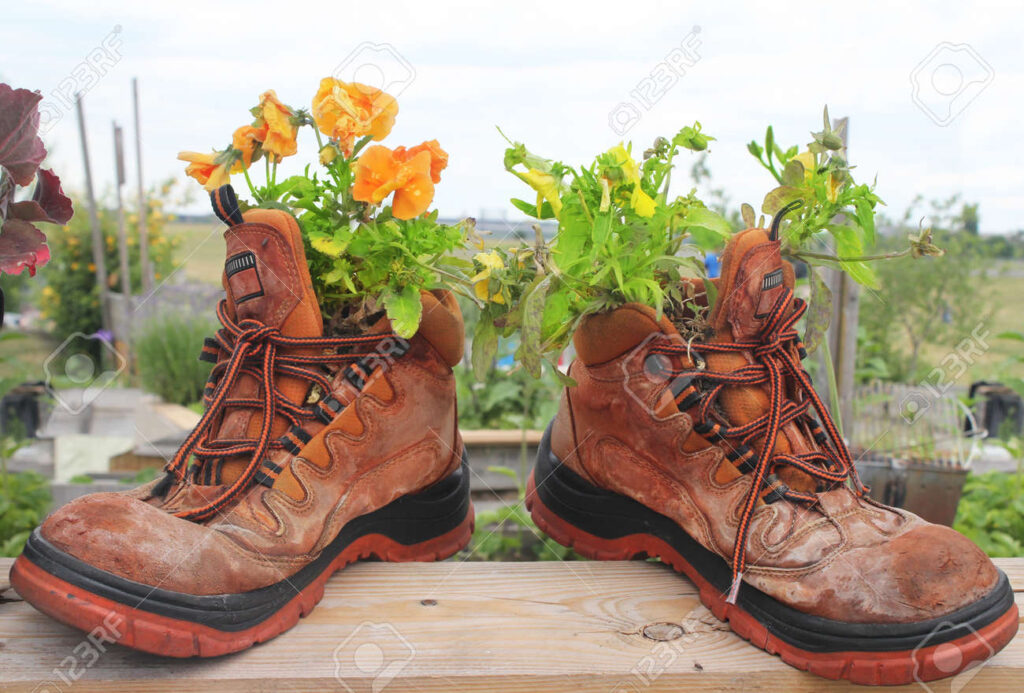 Old boots – especially those well-worn leather ones – can transform into rustic, charming plant pots. Drill a few holes in the soles for drainage, fill them with potting soil, and plant something vibrant. Imagine a pair of boots blooming with petunias or pansies, adding a whimsical touch to your garden or balcony.