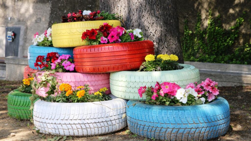 Got an old tire lying around? These can be upcycled into large, dramatic planters for your outdoor space. Paint them in bright, bold colors and fill them with a mix of flowers and greenery. It’s an eco-friendly statement piece that’s sure to turn heads.